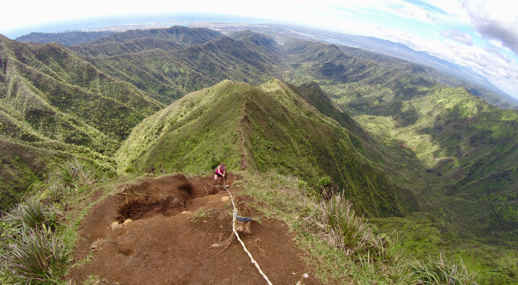 When we reached the top there was a large radio tower. We stopped here to eat lunch before starting our descent of the Haiku stairs on the other side. Here was our first glimpse: