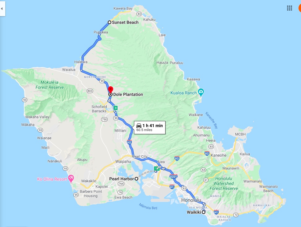 This itinerary stars from Waikiki with stops at Pearl Harbor, the Dole Plantation, and Sunset Beach in less than two hours (one-way, driving time only)