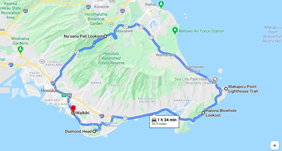 Many breathtaking views along this 1.5 hour route (driving time only). Stops including Nu’uanu Pali, Makapu’u Lighthouse, Halona Blowhole, Diamond Head and Waikiki.