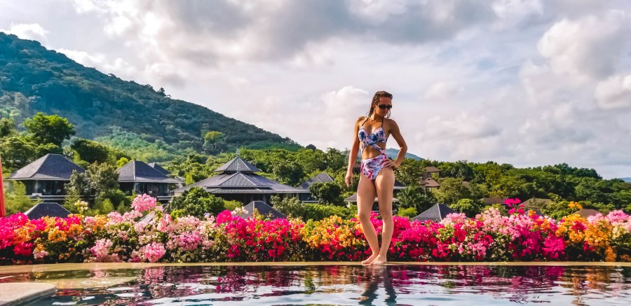An amazing flowerbed with an array of pink flowers and a view in Phuket, Thailand