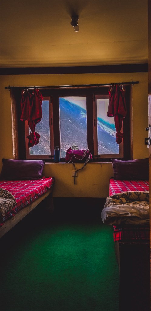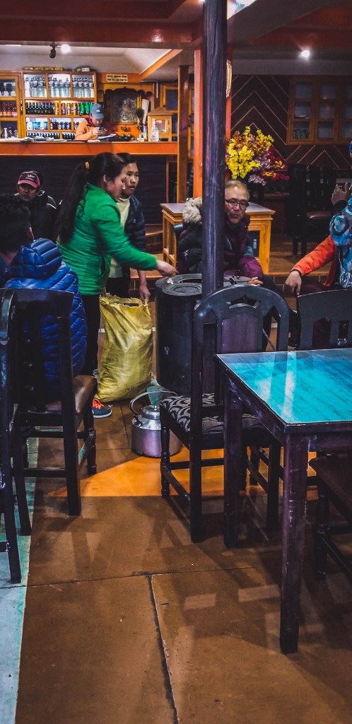 At the restaurant we enjoyed some warm Dhal Bhat (a traditional dish of Nepal) consisting of steamed rice, vegetables, and dumplings. We found this dish to be tasty and quite appetizing, which was very lucky, as Dhal Bhat is one of the main dishes offered throughout the trek.